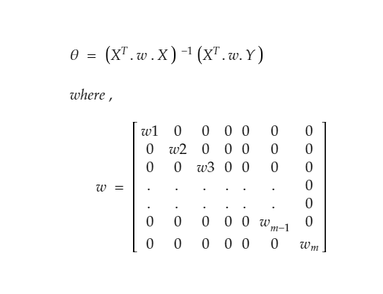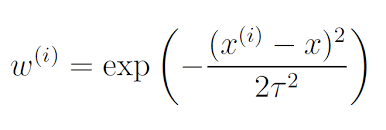 # note: if there is multivaraite data we should have calculated w using w = exp(-(Euclidean distance of querypoint)**2 / 2*tau*tau)