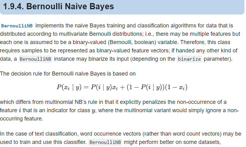 - The difference is that while MultinomialNB works with occurrence counts, BernoulliNB is designed for binary/boolean features.