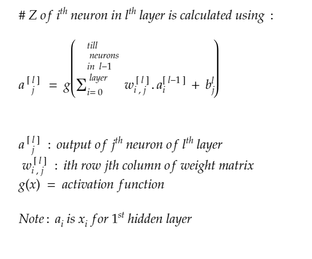 Note: Each neuron in hidden layer or output layer is going to act as a biological neuron hence taking inputs -> generting Z as Weighted sum of inputs with bias included and then output of particular neuron is g(Z) which will act as input for next layer neurons