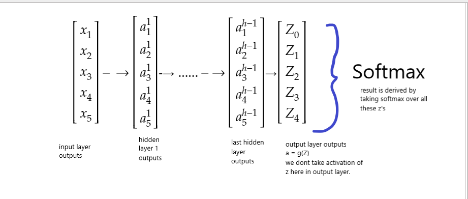 In output layer we will not use g(z) or activation function we find out z = weighted sum +bias and then take softmax over all these z's
